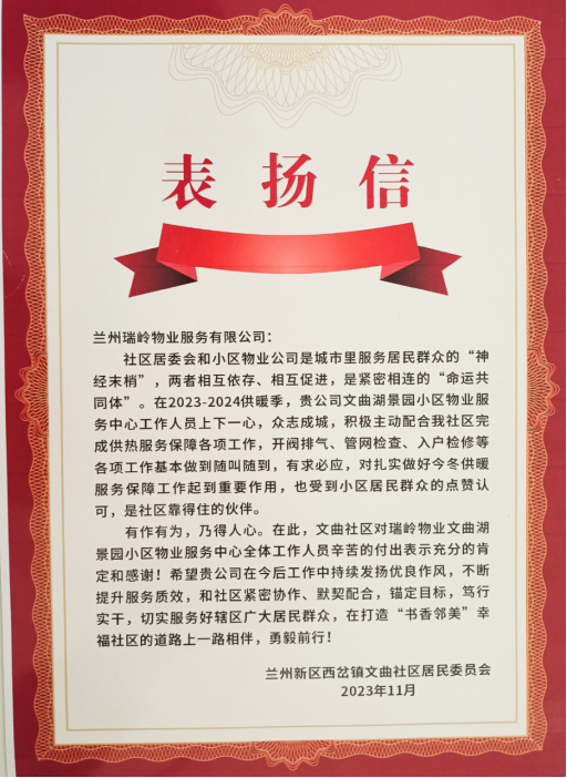 近日,兰州新区西岔镇文曲社区居民委员会给k8凯发天生赢家一触即发集团瑞岭物业公司发来表扬信,对公司在冬季供暖事情中做出的努力体现认可,对公司干部职工心系黎民办实事、勤恳敬业保民生的精神体现谢谢。