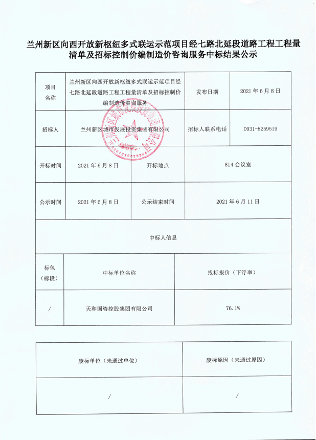 • 兰州新区向西开放新枢纽多式联运示范项目经七路北延段门路工程工程量清单及招标控制价体例造价咨询效劳中标结果公示