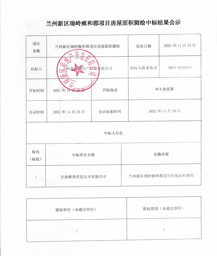 兰州新区瑞岭雍和郡项目衡宇面积测绘中标结果公示
