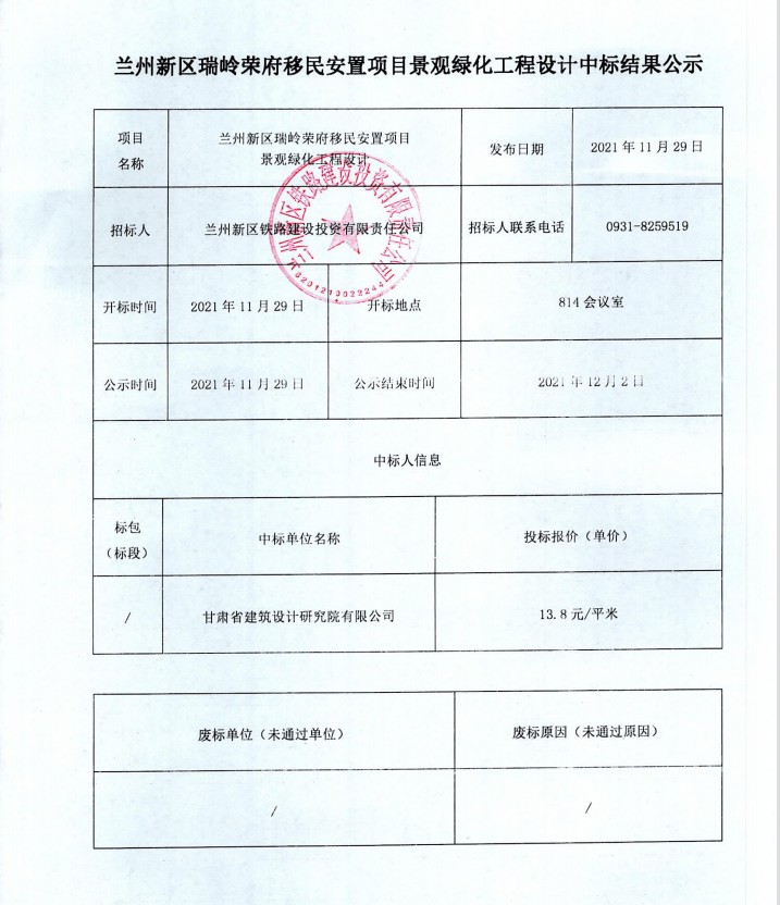 兰州新区瑞岭荣府移民安顿项目景观绿化工程设计中标结果公示