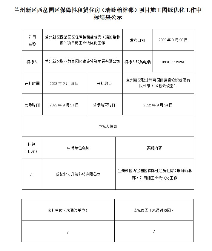 兰州新区西岔园区包管性租赁住房(瑞岭翰林郡)项目施工图纸优化事情中标结果公示