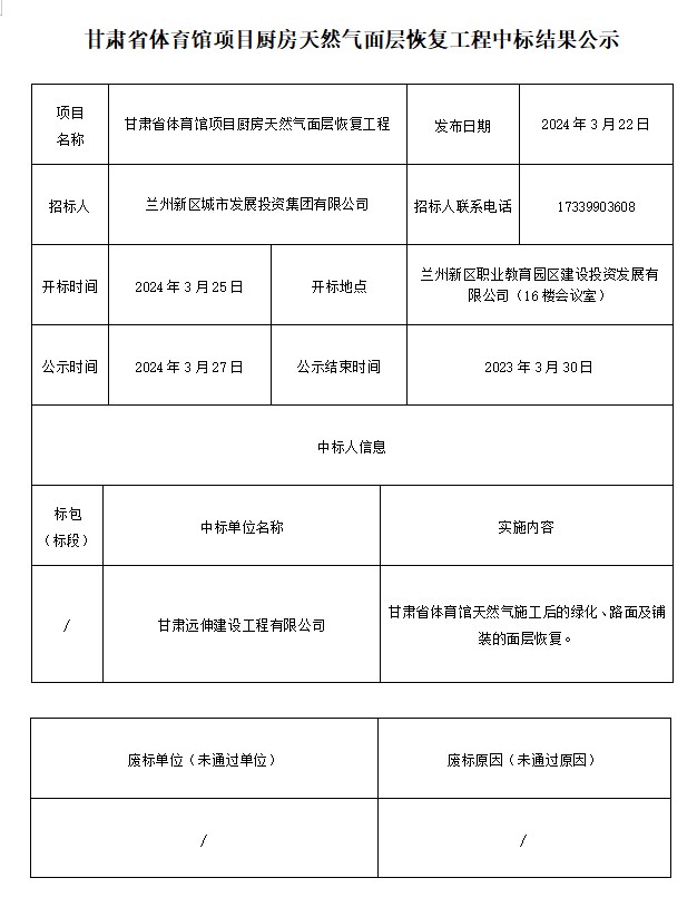 甘肃省体育馆项目厨房天然气面层恢复工程中标结果公示